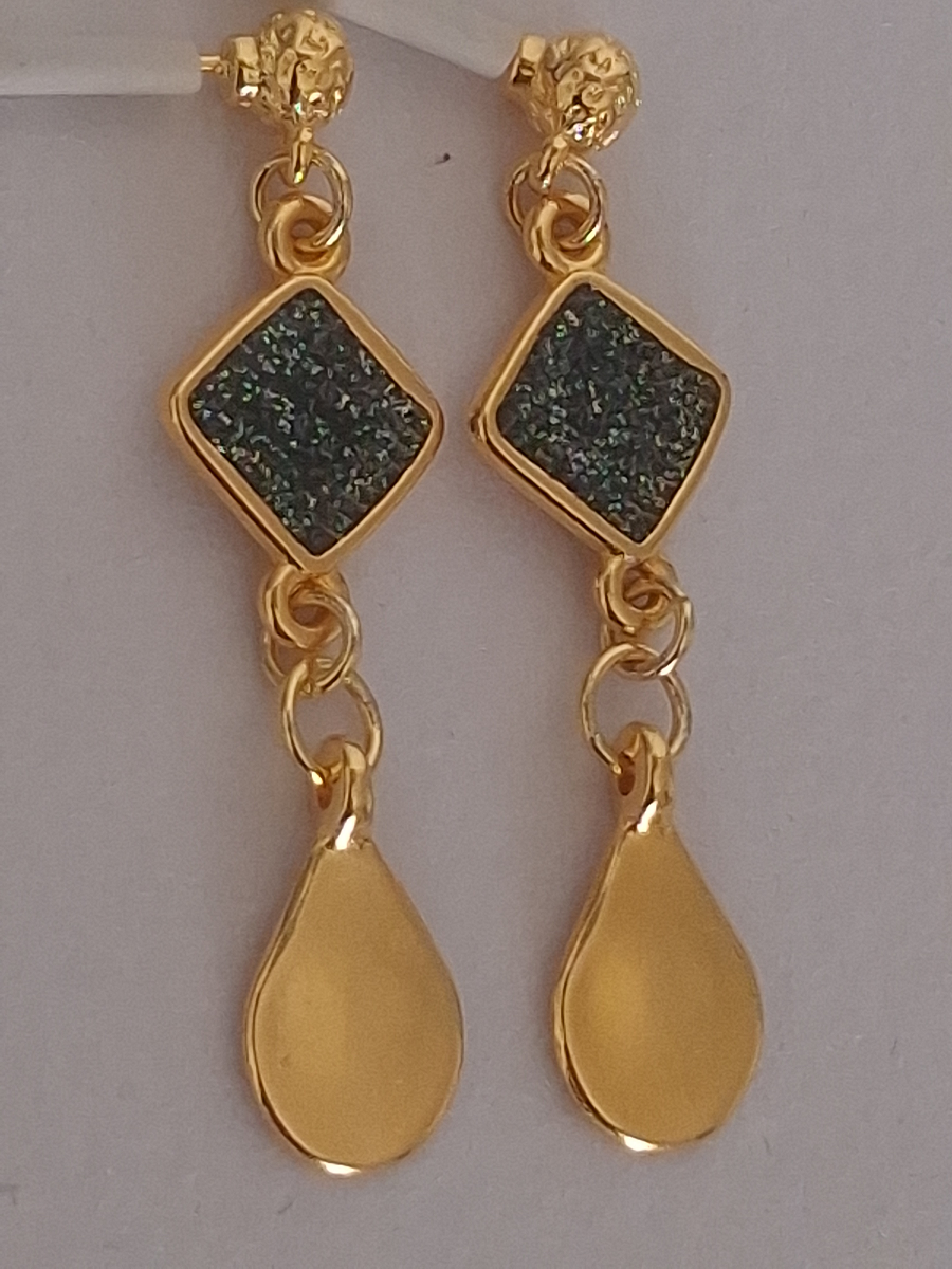 Σκουλαρίκια ρόμβος με σμάλτο μαύρο με glitter 13mm και χυτή σταγόνα 10x15mm. Zamak 24k Gold plated (επιχρύσωση)